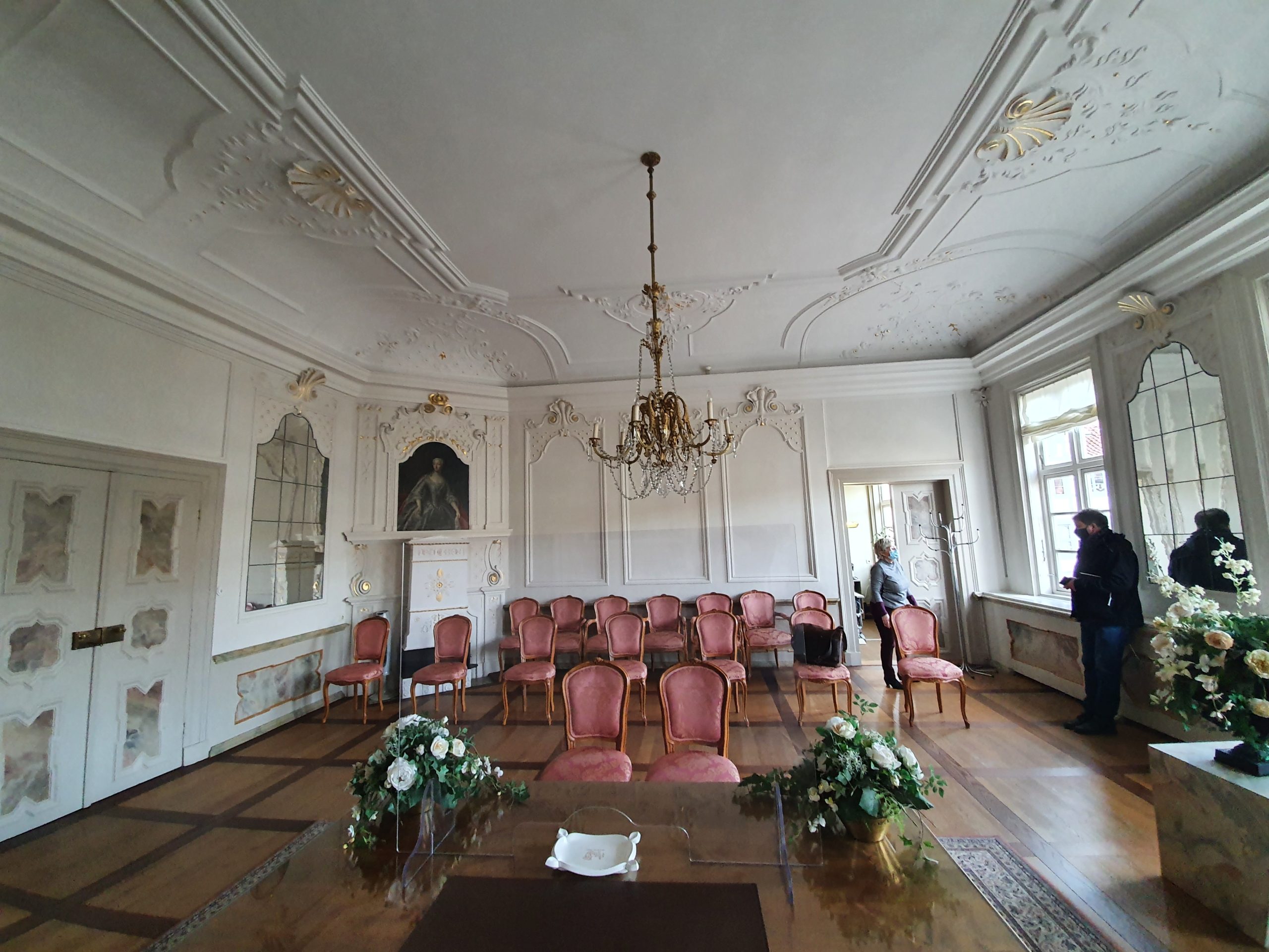 In Abstimmung mit dem Denkmalschutz wurde zunächst eine umfangreiche Bestands- und Schadensaufnahme durchgeführt. Das gesamte Gebäude wurde statisch berechnet und Reparaturen für geschädigte Bauteile konstruiert und bemessen. Für die Decken über EG und OG wurden Ertüchtigungsvarianten abgestimmt und bemessen, um die bemalten Putzoberflächen zu erhalten und gleichzeitig die uneingeschränkte Nutzung als Standesamt zu ermöglichen. Dabei wurde auf maximalen Substanzerhalt und die Reversibilität der Reparaturen/Ertüchtigungen großen Wert gelegt.