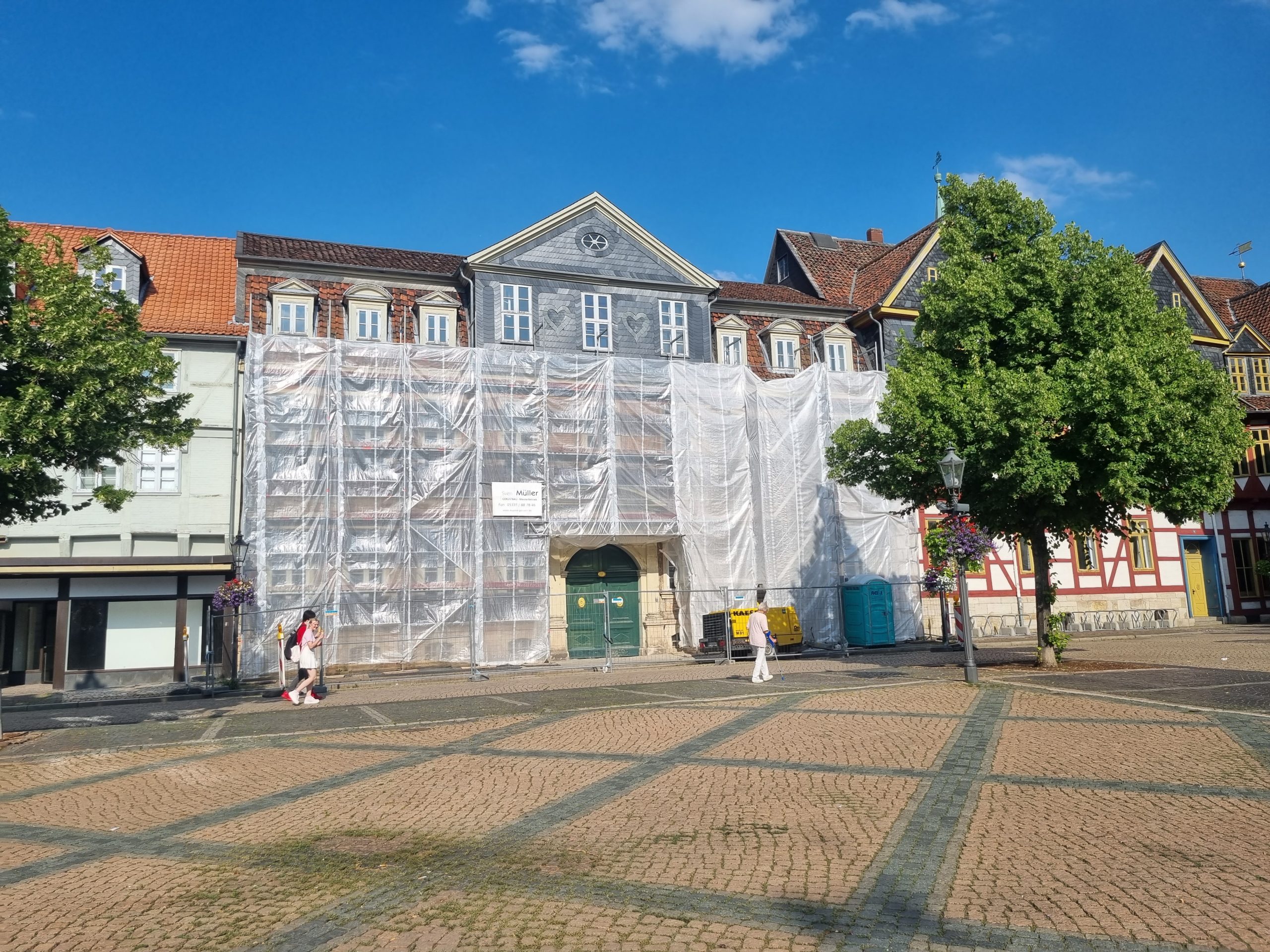 In den Fassaden lagen fachwerktypische Schäden vor, die jedoch teilweise durch den zähelastischen Anstrich stark ausgeprägt waren. Zudem wurden im Bereich der Traufe/des Zwerchhauses auf der Vorderseite sehr umfangreiche Schäden durch den echten Hausschwamm festgestellt, die bis in die Stuckdecken hineinreichten.